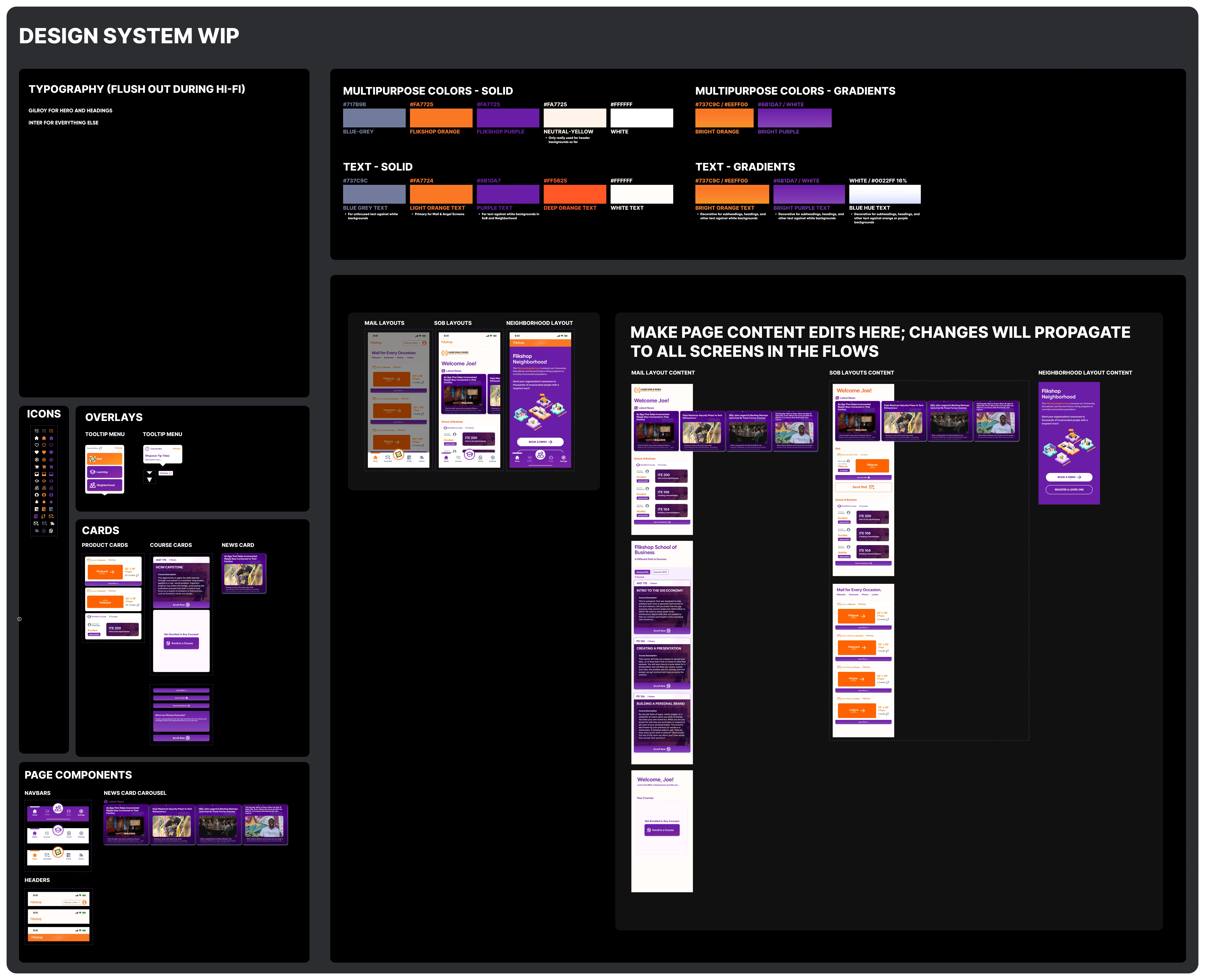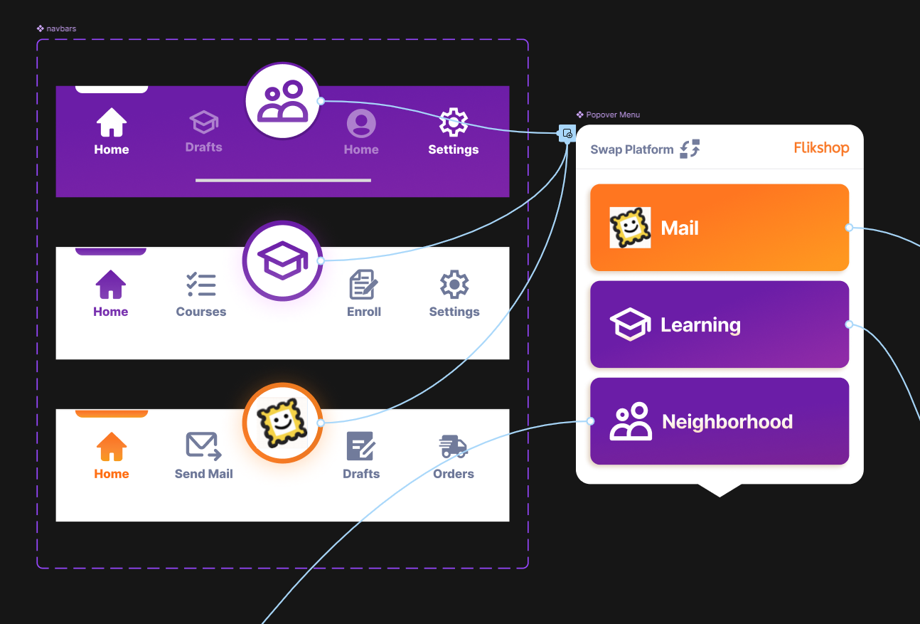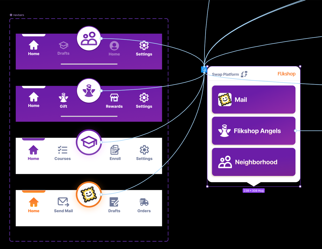 Based on insights from sprint 0, the team focused on integrating the Flikshop Neighborhood and School of Business within a Flikshop Mail app. Work was also done to modernize the aesthetics and accomodate new interaction patterns such as hotswapping between product platforms.